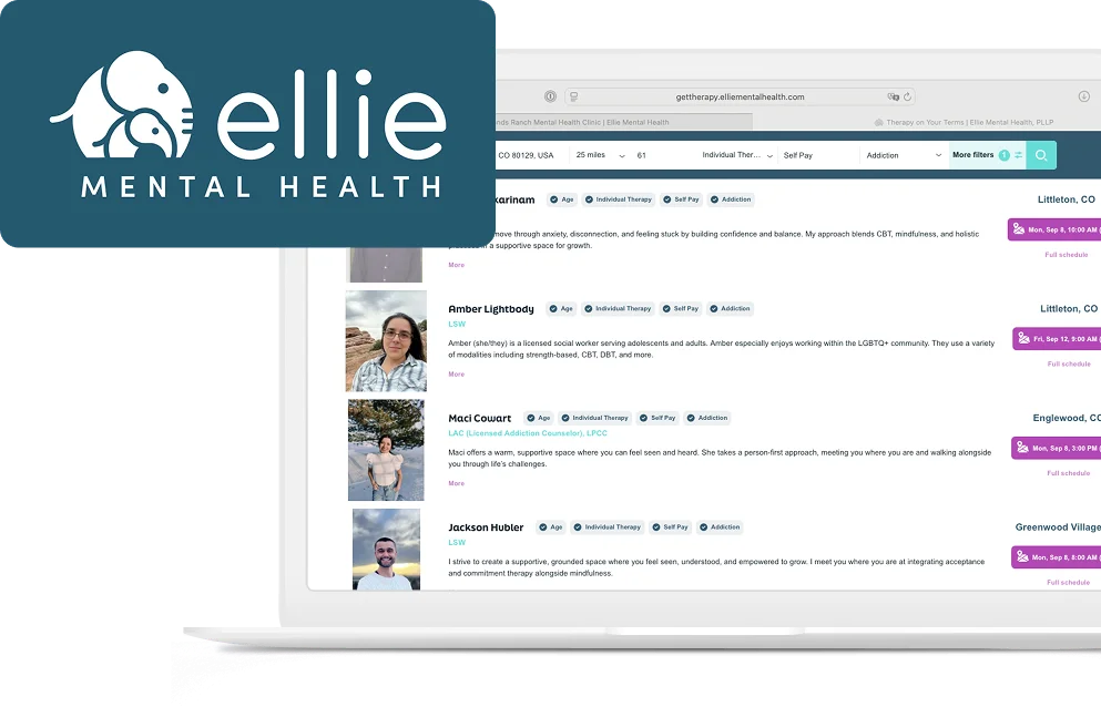Ellie Mental Health is a franchised network providing mental health services across 265 facilities in the USA. The network offers therapists specializing in a broad range of mental health areas, including anxiety, couples therapy, depression, grief, family therapy, trauma, anger management, and more.